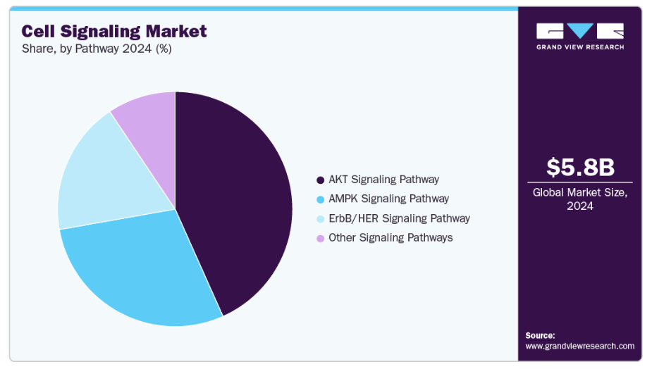 AKTシグナル伝達経路は2024年に市場を支配し、43.32%のシェアを占めました。生存経路とも呼ばれるAKTシグナル伝達経路は、細胞の発達、アポトーシスシグナル、細胞増殖を調節します。このシグナル伝達経路は、最も一般的ながん種類において最も頻繁に異常調節されるものです。AKT経路のダウンレギュレーションを背景とした商用診断検査の成長予測は、今後予想される期間において細胞シグナル伝達分野の成長を促進するでしょう。