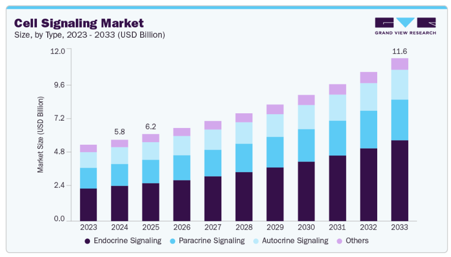 内分泌シグナル伝達は2024年に43.21%と最大の収益シェアを占め、2033年まで最速の成長が見込まれています。これは、生理学的システム全体における長距離ホルモン伝達の調節における重要な役割に加え、代謝障害、がん、内分泌関連疾患における研究の拡大が牽引しています。