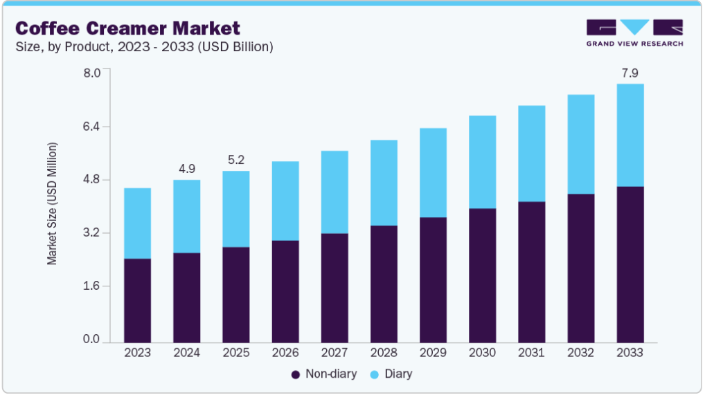 ■ 英語タイトル:Coffee Creamer Market (2025 - 2033)Size, Share & Trends Analysis Report By Product (Dairy-based, Non-dairy), By Type (High-fat, Low-fat, Fat-free), By Form (Liquid, Powder), By Nature, By Packaging Type, By Flavor, By Distribution Channel, By Region, And Segment Forecasts