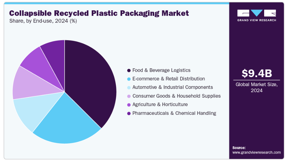 折りたたみ式クレート・トートセグメントは、2024年に43.0%を超える最大の市場収益シェアを記録しました。折りたたみ式クレートとトートは、折りたたみ式再生プラスチック包装産業で最も広く使用されている製品の一つです。主に食品・飲料物流、小売流通、自動車部品の取り扱いにおいて活用されています。このセグメントの成長は、小売、電子商取引、食料品サプライチェーン全体で、省スペース性と返却可能な物流包装に対する需要が増加していることに起因しております。