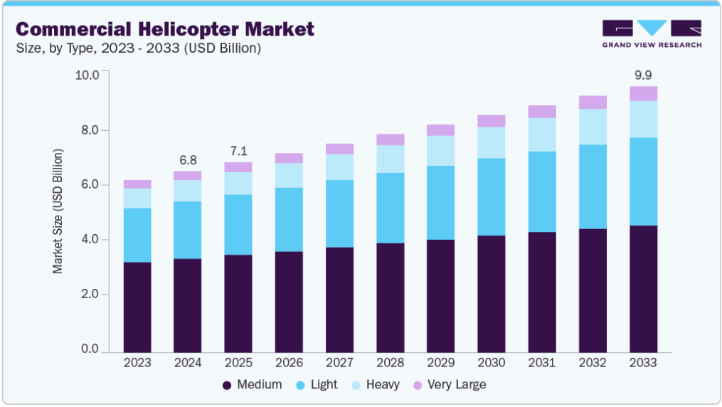 ■ 英語タイトル:Commercial Helicopter Market (2025 - 2033 )Size, Share & Trends Analysis Report By Type (Light, Medium, Heavy, Very Large), By Application (Oil & Gas, Transport, Medical Services, Law Enforcement & Public Safety), By Region, And Segment Forecasts