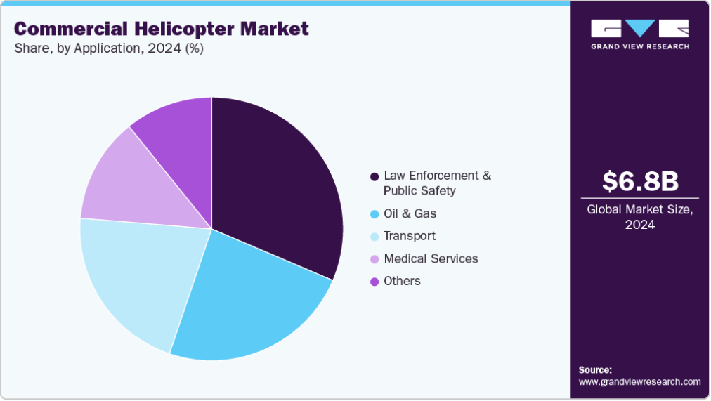 中型ヘリコプターセグメントは、2024年に51%以上の市場シェアを占め、市場を支配しました。これは、オフショア石油・ガス事業、捜索救助(SAR)任務、旅客輸送など、数多くの用途における汎用性によって牽引されたものです。これらのヘリコプターは、積載量、航続距離、運用効率のバランスを提供し、多様な商業ニーズに適しています。燃料効率、安全性、運用コストの改善を目指す技術革新が、このセグメント成長過程の主要な推進要因である。