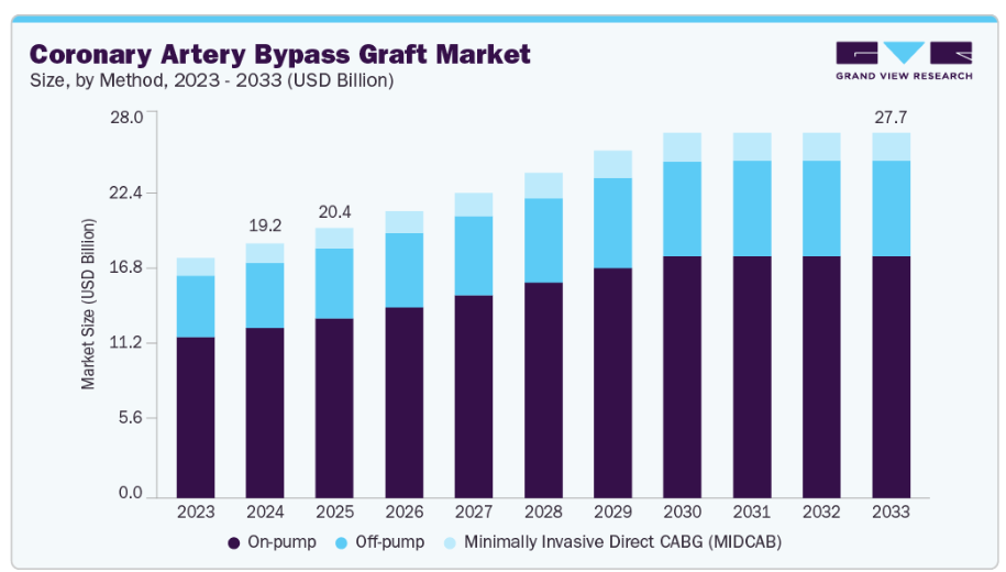 冠動脈疾患(CAD)の増加傾向が市場成長を牽引しております。2024年10月に発表されたCDC(米国疾病予防管理センター)の論文によれば、米国では20歳以上の成人の約5%に相当する、ほぼ20人に1人が冠動脈疾患(CAD)の影響を受けております。この膨大な患者数は、心臓関連の罹患率および死亡率の主要な原因であり続けるCADが、臨床現場において継続的な課題であることを浮き彫りにしております。多くの患者様において、進行したCAD症例は低侵襲治療では不十分なため外科的介入が必要となります。その結果、冠動脈バイパス移植術(CABG)は依然として重要な治療法として位置づけられており、心血管治療全体における重要性を強化するとともに、市場需要の主要な推進力としての役割を強調しています。