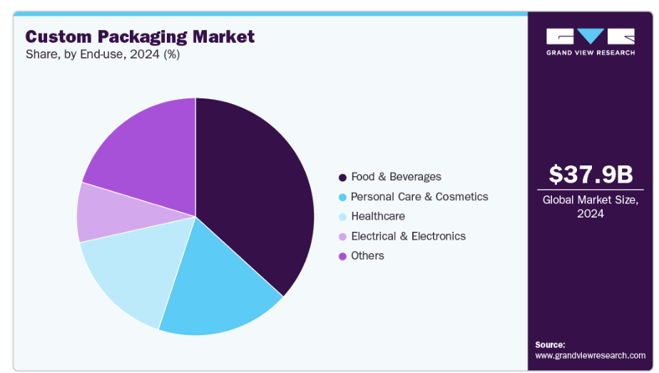 食品・飲料セグメントはカスタム包装産業を牽引し、2024年には市場シェアの36.0%以上を占めております。これは、同産業の幅広い消費者基盤と、ブランド差別化・安全性・保存期間における包装の重要な役割に起因します。この分野のカスタム包装には、特注の箱形状、分量管理容器、ブランド包装、そして高まる環境意識のトレンドに沿った持続可能な素材が含まれます。オンライン食品配達やミールキットの台頭も、カスタマイズされた耐久性・耐熱性のある包装の需要を拡大させています。