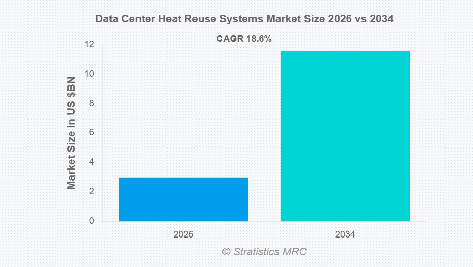 Stratistics MRCによると、世界のデータセンター熱再利用システム市場は2026年に29億5,000万ドル規模となり、予測期間中に年平均成長率(CAGR)18.6%で成長し、2034年までに115億6,000万ドルに達すると見込まれています。