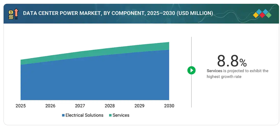 UPS、PDU、およびエネルギー貯蔵システムは、信頼性が高く、継続的かつ拡張可能な電力を確保することで、データセンターの電力市場を牽引し、中断のない運用を実現しています。