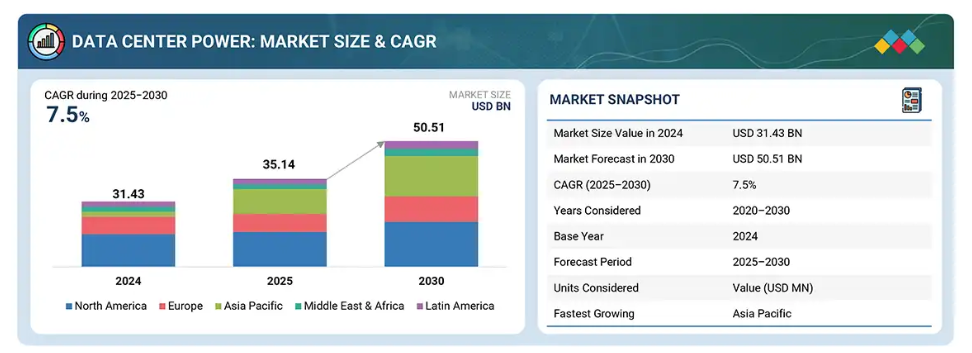 予測期間中、北米はデータセンター電力市場において最大の市場シェアを占めると見込まれており、アメリカとそのハイパースケール開発が牽引役となります。AWS、Google、Microsoftによるデータセンターの急速な拡大が、耐障害性、拡張性、エネルギー効率に優れた電力インフラへの需要を促進しています。2024年8月、CBREはデータセンター容量が10%増加したこと、利用可能スペースが過去最低の2.8%となったこと、建設中のプロジェクトが69%増加したことを報告し、信頼性の高い電力システムへの需要の高まりを強調しました。再生可能エネルギー、ハイブリッドソリューション、先進的な冷却技術の統合は、同地域のグローバルなリーダーシップをさらに強化しています。