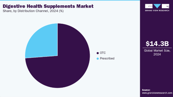 2024年、市販薬(OTC)を通じた消化器の健康サプリメント市場は、世界売上高の約73.8%を占め、最大のシェアを占めました。これらの小売店において消化器系健康サプリメントが広く入手可能であるため、消費者はこれらの製品を日常生活に取り入れやすくなっています。さらに、ハイパーマーケットやスーパーマーケットにおける多様な品揃えと競争力のある価格設定が、このセグメントの成長に寄与しており、様々な好みや予算を持つ幅広い層の消費者にアピールしています。