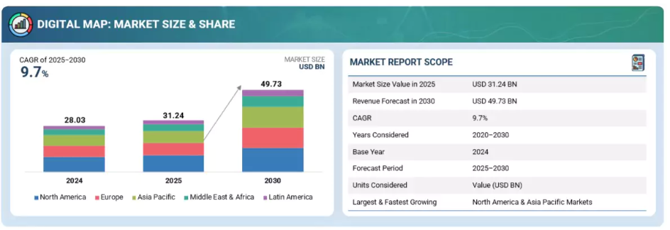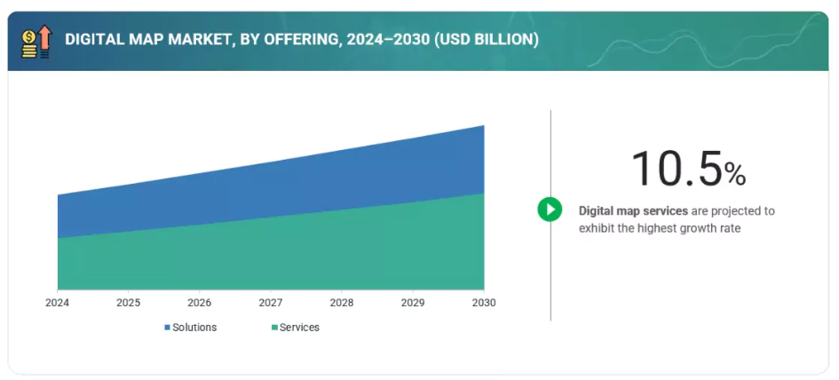 デジタルマップ市場は、リアルタイムナビゲーションの需要増加、位置情報サービスの普及拡大、ならびに運輸・物流・政府・スマートシティ構想などにおける応用範囲の拡大により、急速な成長を遂げております。各産業の組織は、データ駆動型の都市計画やインフラ開発を支援するため、また防衛・緊急対応分野における安全性と状況認識の向上を図るため、デジタルマッピングソリューションやサービスの採用を加速させております。