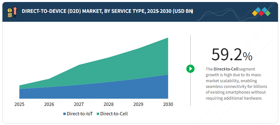 ダイレクト・トゥ・デバイス(D2D)市場の将来的な成長は、衛星コンステレーションの大規模展開、マルチオービットネットワークの統合拡大、消費者・企業・政府セクターにおける採用拡大によって促進される見込みです。3GPP NTN規格によりスマートフォンやIoTデバイスが衛星対応となることで、D2Dサービスは緊急時やニッチ用途から主流の接続ソリューションへと進化すると予想されます。