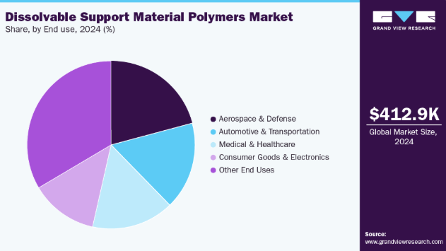 航空宇宙・防衛分野はエンドユース別セグメントにおいて収益ベースで市場を支配し、2024年には20.83%の市場シェアを占めました。2025年から2033年にかけて年平均成長率(CAGR)11.5%で成長すると予測されています。航空宇宙・防衛分野では、複雑な内部形状、トポロジー最適化部品、手作業によるサポート除去が許容されないオンデマンド迅速交換部品の需要により、溶解性サポート材の需要が牽引されている。