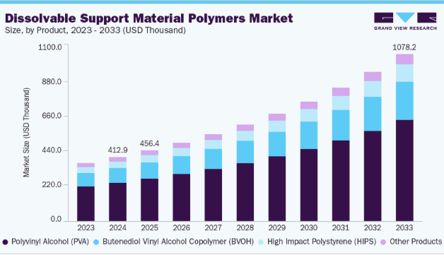 ポリビニルアルコール(PVA)は、収益ベースで製品セグメント全体において市場を支配し、2024年には59.87%の市場シェアを占めました。2025年から2033年にかけては11.5%のCAGRで成長すると予測されています。環境に優しく、容易にリサイクル可能な製造ワークフローへの需要の高まりは、PVAの商業的地位を強化している。その水溶性と生分解性は、部品分離や使用済み処理を簡素化するからだ。