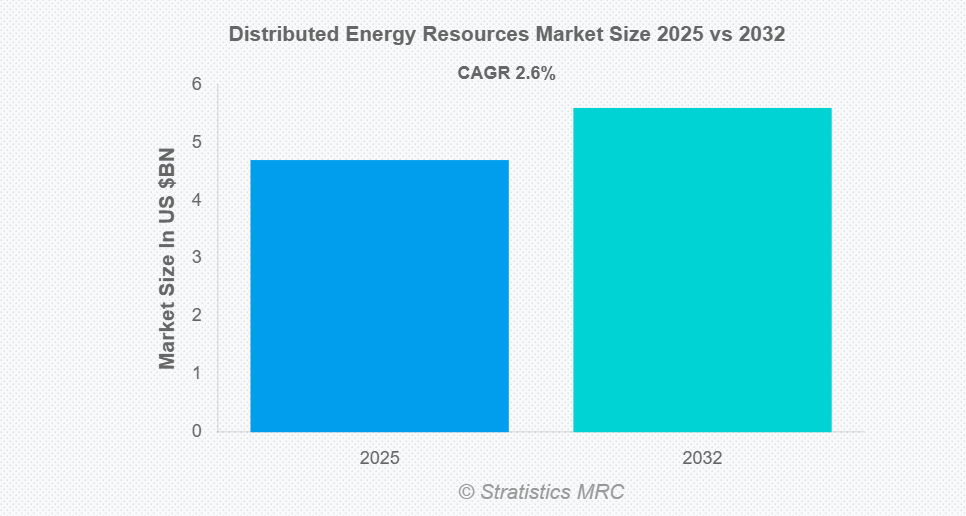 Stratistics MRCによると、世界の分散型エネルギー資源(DER)市場は2025年に47億ドル規模となり、予測期間中に年平均成長率(CAGR)2.6%で拡大し、2032年までに56億ドルに達すると見込まれています。