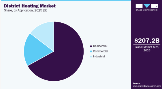 2025年には、住宅セグメントが総収益の67%を占め、主要な用途カテゴリーとしての地位を維持しました。都市部の人口密度の増加、集合住宅における暖房需要の高まり、および集中暖房システムの導入拡大により、住宅部門における地域エネルギーネットワークへの依存度は引き続き高まっています。地域暖房パイプラインネットワーク市場における継続的なアップグレードに加え、断熱基準の向上やスマートメーター技術の導入により、住宅向け地域暖房の効率性と費用対効果は向上しています。クリーンで共有型の暖房インフラを促進し、個別ボイラーからの排出削減を図る支援政策は、新規開発および改修プロジェクトの両方において、このセグメントの主導的なシェアをさらに強化しています。
