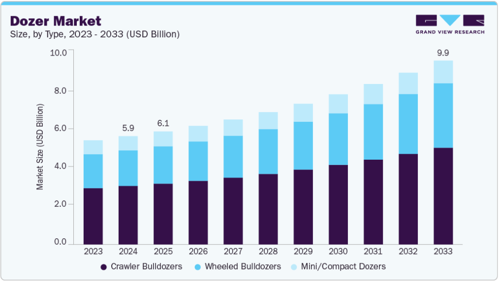 ミニ/コンパクトドーザーセグメントは、2025年から2033年にかけて最も高いCAGRで成長過程に入ると予測されています。都市インフラ開発の増加、狭隘な建設現場におけるコンパクトで汎用性の高い機器への需要高まり、住宅・商業用不動産への投資拡大、中小規模プロジェクト向けの費用対効果の高い土工作業ソリューションの必要性といった要因が、予測期間中のセグメント成長を支えます。コンパクトドーザーの汎用性と低い運用コストが、限られた空間での造園、道路工事、公共施設設置、都市建設プロジェクトに理想的であることから、セグメントの成長過程はさらに後押しされる。