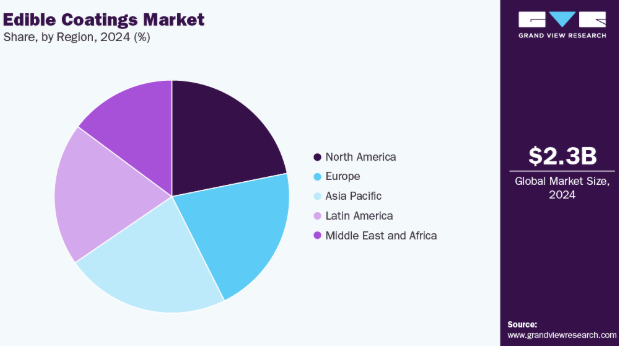 北米食用コーティング産業は2024年に34.41%の世界最大の収益シェアを占め、グローバル市場を支配した。確立された食品加工産業の強力な存在感、高度な研究開発能力、持続可能な食品保存技術の早期導入が市場を牽引している。クリーンラベルや環境に優しい製品に対する消費者の高い意識と、近代的なコールドチェーン物流の普及が相まって、地域市場の成長をさらに支えている。さらに、主要小売業者や食品ブランドにおける食品廃棄物の削減と企業の持続可能性目標達成への強い注力が、北米全域で食用コーティングソリューションの革新と大規模導入を推進し続けている。