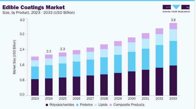 2024年には果物・野菜セグメントが39.99%の収益シェアで市場を牽引しました。収穫後損失の削減、保存期間の延長、長距離輸送中の鮮度維持に対する世界的な関心の高まりが市場を推進しています。消費者が新鮮で自然、最小限の加工を施した農産物を求める中、食用コーティングは合成保存料やプラスチック包装に代わる効果的で持続可能な選択肢を提供します。生産者は特に輸出向け果実・野菜において、水分損失抑制、熟成遅延、視覚的魅力向上のため、多糖類・タンパク質ベースのコーティングを積極的に採用している。