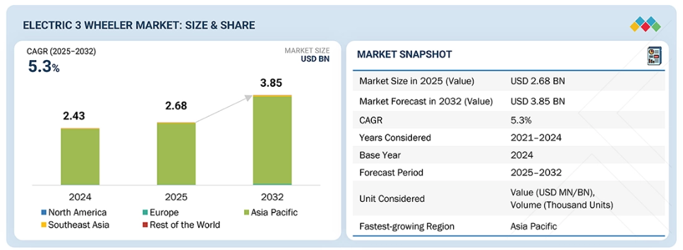 電気三輪車市場は、2025年の26億8,000万米ドルから2032年までに38億5,000万米ドルへ成長し、年平均成長率(CAGR)5.3%を記録すると予測されています。