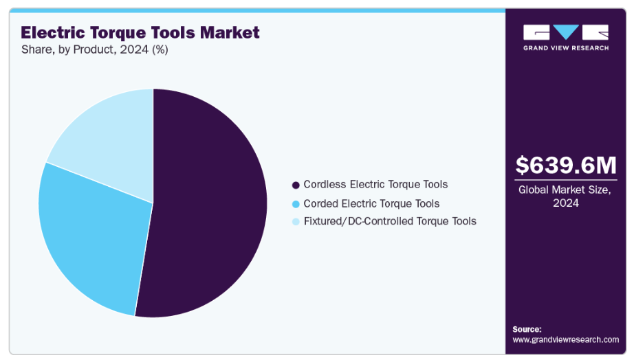 コードレス電動トルクツールセグメントが市場を牽引しております。産業現場や野外作業における機動性・柔軟性・操作性の需要増により、2024年には52.5%という最大の収益シェアを占めました。バッテリー駆動のトルクツールは電源コードに依存せず正確な締結作業を可能とし、生産性向上に寄与します。自動車・航空宇宙・電子産業における保守・修理・組立サービスの拡大が需要を後押ししております。バッテリー寿命、モーター効率、人間工学に基づいた設計の進歩がユーザー体験を向上させています。