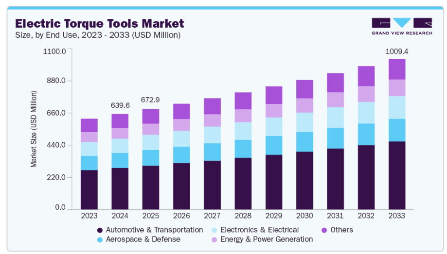 自動車・輸送機器分野が市場を牽引し、2024年には43.6%という最大の収益シェアを占めました。これは精密な車両組立・メンテナンス需要の増加が背景にあります。電動トルク工具はエンジン、シャーシ、サスペンションシステムにおける正確な締結を保証し、部品損傷リスクを低減します。電気自動車・ハイブリッド車の普及は、専用トルク工具の必要性をさらに加速させています。メーカー各社は生産効率と品質向上のため、先進的なデジタルトルク監視システムの導入を進めています。