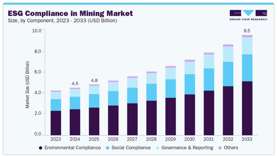 ESGコンプライアンスは鉱業企業にとって大きな成長機会をもたらします。ESGイニシアチブを統合する企業は、ブランド評価の向上、倫理意識の高い投資家の誘致、グローバルサプライチェーンへの優先的アクセス獲得が可能となります。モニタリング、報告、資源効率化における技術進歩により、企業は持続可能な実践を費用対効果の高い方法で実施できます。さらに、電子、自動車、再生可能エネルギーなどの分野における責任ある調達鉱物への需要増加は、新市場の開拓、製品の差別化、持続可能性を重視するバイヤーとの長期的なパートナーシップ構築の機会を提供します。