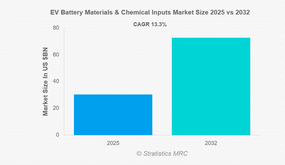 Stratistics MRCの調査によると、世界の電気自動車用電池材料・化学原料市場は2025年に303億5,000万ドル規模となり、予測期間中に年平均成長率(CAGR)13.3%で拡大し、2032年には727億3,000万ドルに達すると見込まれています。