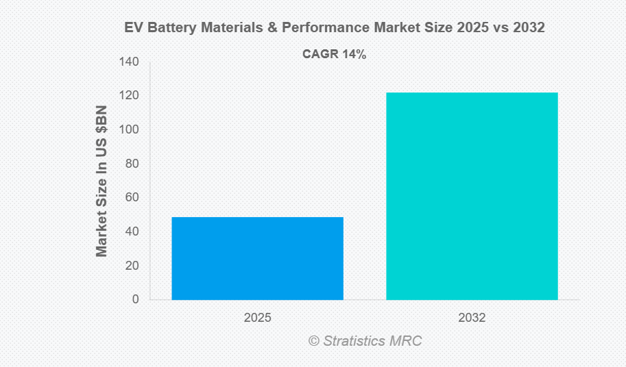 Stratistics MRCの調査によると、世界のEV用電池材料・性能市場は2025年に488億ドル規模となり、予測期間中に年平均成長率(CAGR)14.0%で拡大し、2032年には1,221億1,000万ドルに達すると見込まれています。