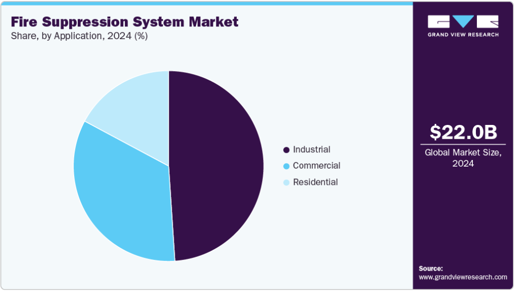 産業セグメントは2024年に49.0%のシェアを占め、業界を支配した。製造工場、エネルギー生産施設、倉庫、物流拠点を含む産業施設は、可燃性物質や重要な操業設備により高い火災リスクに直面している。このセグメントの拡大は、職場の安全確保、資産保護、規制認証維持のための堅牢で法令準拠の消火システム需要に牽引されている。世界的な産業活動の規模拡大とダウンタイム最小化の重視により、特殊な産業リスクに対応したガス消火や泡消火などの高性能システムへの投資が増加している。