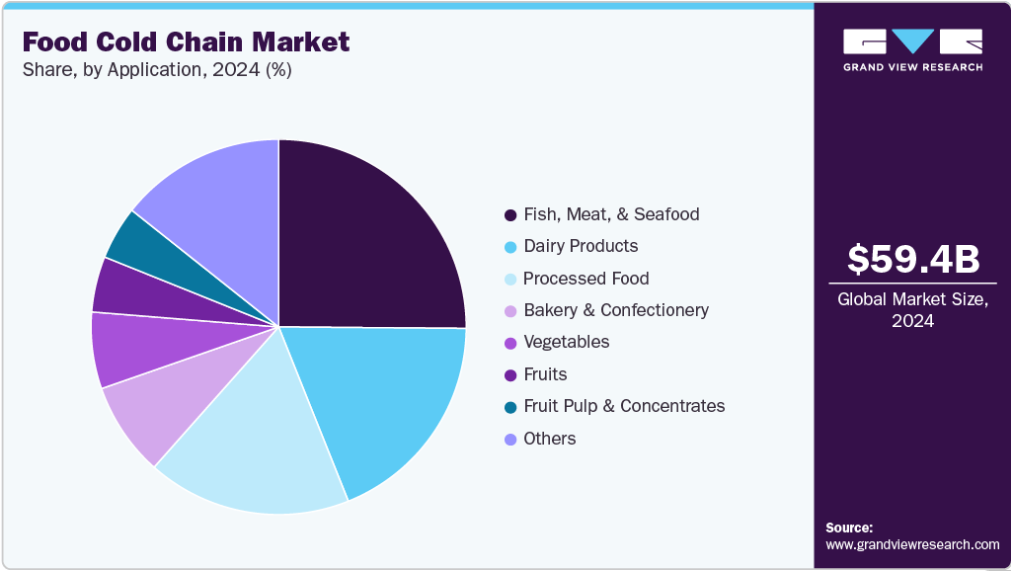 2024年時点で、魚・肉・水産物セグメントが食品コールドチェーン業界を牽引した。用途別では、市場は果物、野菜、果肉・濃縮物、乳製品、魚・肉・水産物、加工食品、ベーカリー・菓子、その他に区分される。市場の成長過程の主な推進要因は、新鮮で高品質かつ安全なタンパク源に対する世界的な需要拡大であり、効率的なコールドチェーン物流の必要性に大きく影響を与えています。