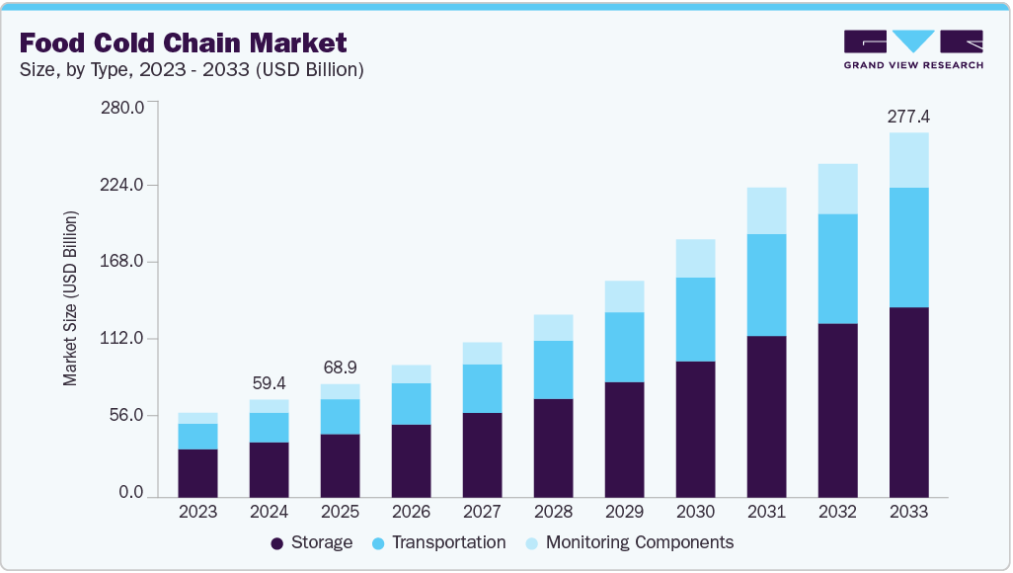 2024年には貯蔵セグメントが56.5%と最大の収益シェアを占めました。貯蔵コンポーネントは、生産から消費までの全行程で食品を最適な低温に維持するための専門施設とソリューションを提供するという重要な役割を果たしています。貯蔵セグメントはさらに、リーファーコンテナと倉庫に細分化される。生鮮食品の需要増加を牽引する要因には、消費者の嗜好の変化、人口増加、都市化が含まれる。さらに、技術進歩は冷蔵貯蔵ソリューションの効率性と信頼性を高める上で重要な役割を果たし、業界におけるその重要性をさらに強化している。