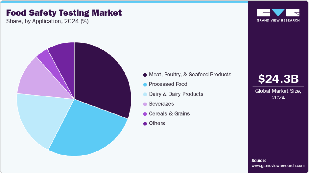 2024年、食肉・家禽・水産物用途別洞察は世界収益シェアの30.6%を占めました。微生物汚染リスクの高さから、食肉・家禽・水産物製品が食品安全検査市場を支配しています。これらの製品は腐敗しやすく、サルモネラ菌やリステリア菌などの病原体に感染しやすい特性があります。規制当局は動物性食品に厳格な安全基準を課しており、これが検査需要を牽引している。このカテゴリーにおける頻繁なリコールや安全事故は、定期的な検査の必要性をさらに強めている。