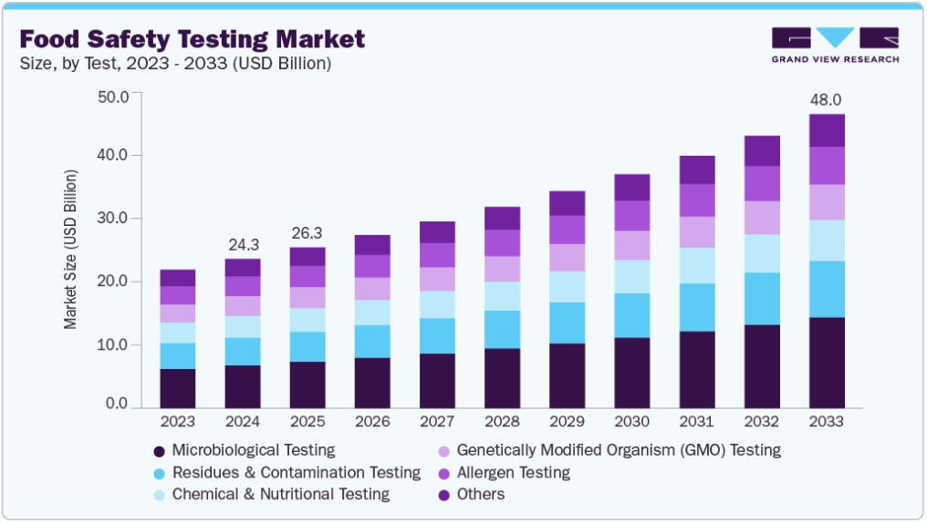 PCRベースのアッセイやバイオセンサーなどの検査技術の進歩により、食品安全診断の速度と精度が向上しました。食品加工企業による迅速検査ツールの導入拡大は、コンプライアンスの確保と製品リコールの削減につながっています。さらに、HACCPやISO 22000などの安全基準の導入増加が市場成長を促進しています。これらの技術革新と規制枠組みが相まって、世界の食品安全検査業界を活性化しています。