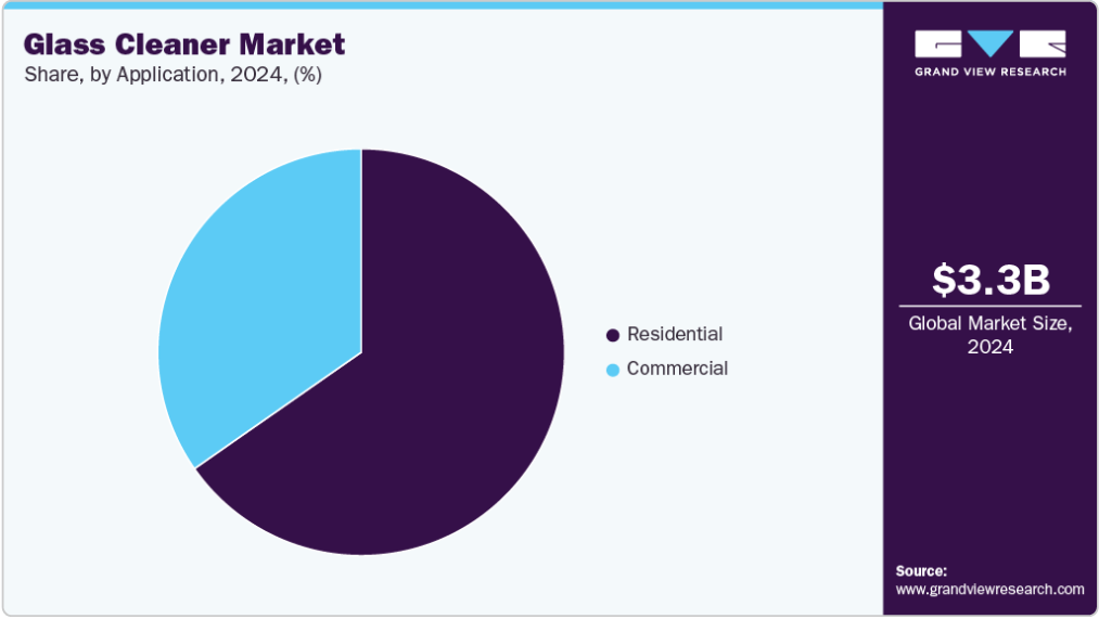 液体ガラスクリーナーは2024年に12億米ドルの市場規模で最大のシェアを占めました。液体ガラスクリーナーは市場最大のセグメントであり、全体の約半数を占めています。この優位性は主に、家庭用窓や鏡から商業用ファサードまで幅広いガラス表面に対する卓越した汎用性と効果的な洗浄性能に起因します。消費者が長年親しんできた液体製剤への慣れと、アンモニアやアルコールベースの溶液による筋の残らない洗浄効果の実証済み特性が相まって、住宅・商業施設を問わずブランド信頼と広範な使用を強化している。