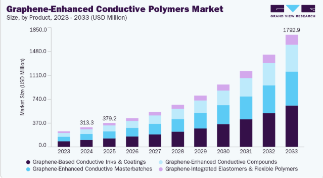 メーカーは加工性を損なわずに目標導電率を達成するため、低添加量のグラフェンを指定するケースが増加中。市場予測では、こうしたクロスセクター用途に牽引され、高い年平均成長率が示されている。