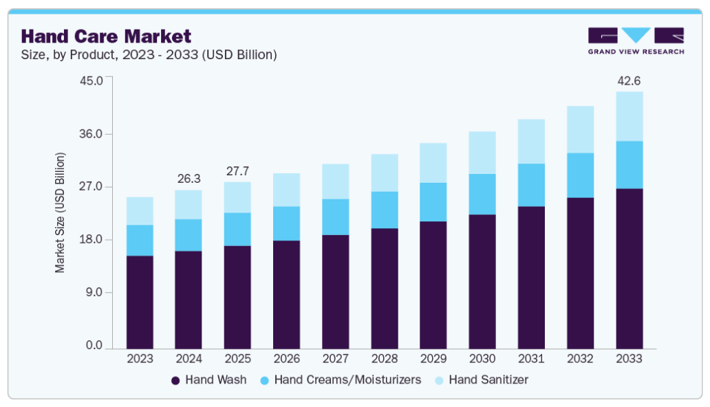 さらに、世界的なハンドケア業界は、COVID-19パンデミック中に高まった衛生意識から持続的な後押しを受けています。手洗いは世界中の保健当局が推奨する重要な予防策となり、その影響は今も消費者の行動を形作り続けています。