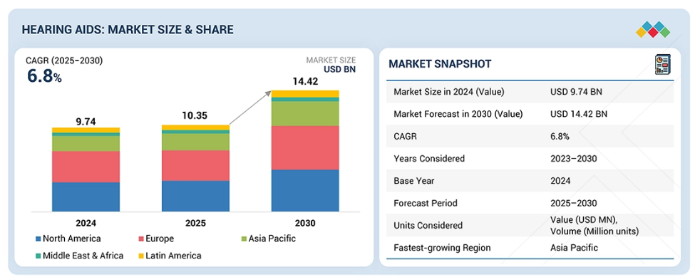世界の補聴器市場は、2025年の103億5,000万米ドルから2030年までに144億2,000万米ドルへ成長し、予測期間中に年平均成長率(CAGR)6.8%を記録すると見込まれています。