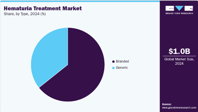 2024年時点で、ブランド品セグメントが血尿治療市場において最大の収益シェアを占めた。これは、強力な臨床的実証、医師からの広範な信頼、確立された流通経路に起因する。チェックポイント阻害剤、膀胱内投与剤、特殊抗生物質を含むこれらの治療法は、多くの場合、確固たる臨床試験データと規制当局の承認に裏付けられており、病院や専門医療機関での優先的な使用を促している。