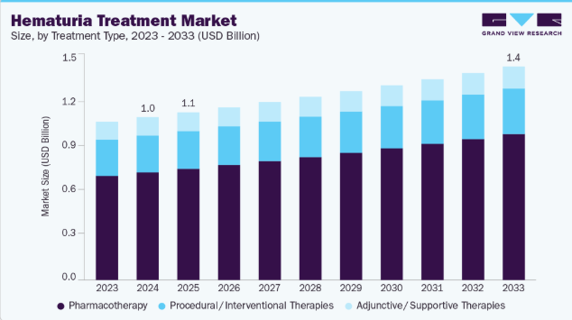 血尿は膀胱癌における最も一般的かつ重要な初期臨床徴候であり、膀胱癌は広範な診断・治療資源を必要とする高負担疾患である。さらに、世界的な膀胱癌症例の増加傾向が市場全体の成長を牽引すると予測される。米国では、米国癌協会が2025年に84,870件の新規症例を予測しており、これは安定した発生率と診断用膀胱鏡検査への継続的な依存を反映している。ほとんどの膀胱癌が反復膀胱鏡検査とリスク適応型膀胱内治療による継続的な監視を必要とすることを考慮すると、症例数の増加が血尿治療産業を牽引している。