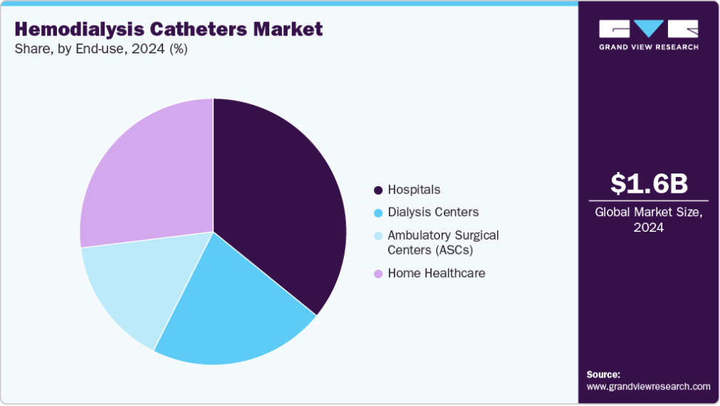 長期使用セグメントは2024年に最大の市場収益シェアを占め、予測期間中に最も高いCAGRで成長すると予想される。これは、継続的な長期透析治療を必要とする慢性腎臓病および末期腎臓病の有病率上昇によるものである。週3回の定期的な透析を受ける患者には、耐久性と信頼性の高い血管アクセスが必要であり、動脈静脈瘻やグラフトが不可能な場合には、トンネル式長期カテーテルが優先的に選択される。これらのカテーテルは長期間留置されるように設計されており、患者の快適性の向上、抗菌コーティング剤による感染リスクの低減、交換回数の減少により、治療全体の負担を軽減する。高齢化人口と糖尿病関連腎合併症の世界的な増加に伴い、長期血管アクセスソリューションの需要は上昇を続けており、このセグメントは支配的かつ最速成長市場として位置づけられています。