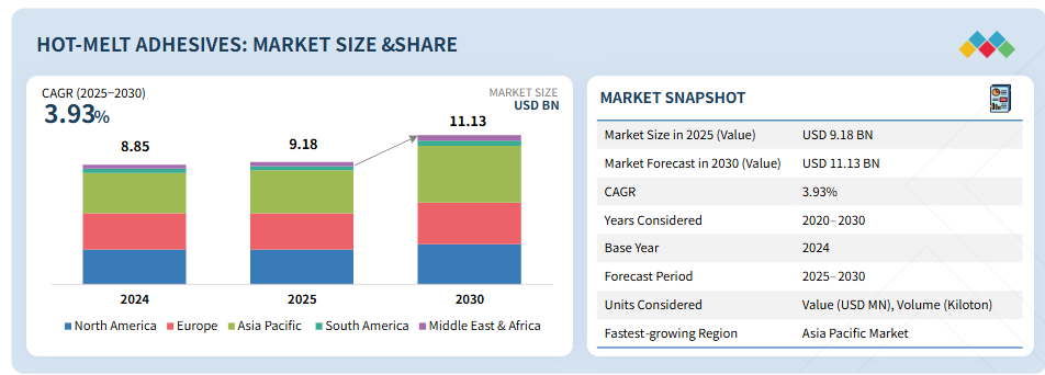 ホットメルト接着剤市場は、2025年の91億8,000万米ドルから2030年には111億3,000万米ドルに達すると予測されており、年平均成長率(CAGR)は3.93%と見込まれております。
