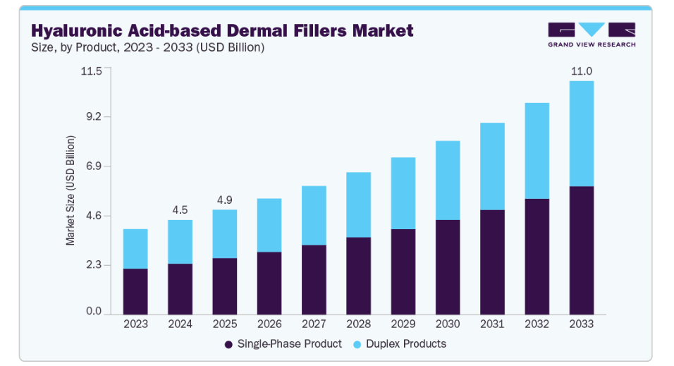 市場拡大の主な要因は、世界的な高齢化人口の増加です。主要経済国では高齢層人口が増加する人口動態の変化が生じており、老化の目に見える兆候と戦い若々しい見た目を保つための美容製品への需要が高まっています。その結果、加齢によるしわ、小じわ、その他の皮膚関連の問題を目に見える形で軽減する注入剤への需要が大幅に増加しています。Simbo AIが発表した記事によれば、40~54歳層が全皮膚充填剤施術の約49%を占め、55~69歳層が約37%を占めています。この傾向は、侵襲性の低い美容施術を選択する高齢者が増加していることを示しており、ヒアルロン酸皮膚充填剤の採用拡大が期待されます。同様に、オーストラリアの2023年世代間報告書によれば、2050年までに同国の65歳から84歳までの人口は2倍以上に増加し、85歳以上の人口は4倍になると予測されています。この人口動態の変化により、高齢者のニーズに応える専門クリニックの数が増加しています。