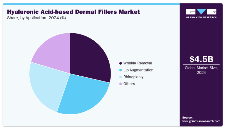 2024年において、しわ除去セグメントが最大の市場シェアを占めました。この成長は、世界的な高齢化と低侵襲美容ケアソリューションへの需要増加によって牽引されています。加齢に伴う変化によりコラーゲンとエラスチンの生成が減少するとともに、紫外線曝露による累積的な光老化がしわを引き起こし、真皮を薄くし、線条を深くします。ヒアルロン酸フィラーは、失われたボリュームを回復させ、物理的にしわを滑らかにし、線維芽細胞の活性化とコラーゲンのリモデリングを促進することでしわを改善し、より持続的な効果をもたらします。皮膚充填剤に関する規制当局の承認と明確な安全性ガイダンスは、臨床医の信頼と患者の受容を強化しています。さらに、国際的な施術調査が示すように、非外科的処置の増加によりしわ治療へのアクセスが拡大し、ヒアルロン酸フィラーは美容医療の核心的なツールとなっています。