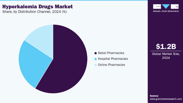 2024年、小売薬局セグメントは高カリウム血症治療薬業界で最大の収益シェアを占め、その強力な存在感とアクセシビリティを反映している。利便性、費用対効果、主要業界プレイヤーによる幅広い製品提供といった要因が、このセグメントの成長を主に牽引している。さらに、小売薬局は広範な医薬品を提供しており、患者にとって便利で好まれる選択肢としての地位を確立している。