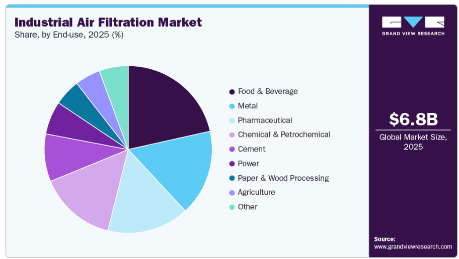 食品・飲料セグメントは、厳格な衛生および汚染管理要件により、市場を支配し、2025年には21.5%のシェアを占めました。加工工場では、製品品質を維持し、食品安全規制を遵守するために、効果的な空気ろ過が不可欠でした。粉塵、ミスト、および臭気制御システムの高利用が、安定した需要を支えました。包装食品および加工食品の生産拡大が、同セグメントの優位性をさらに強固なものにしました。