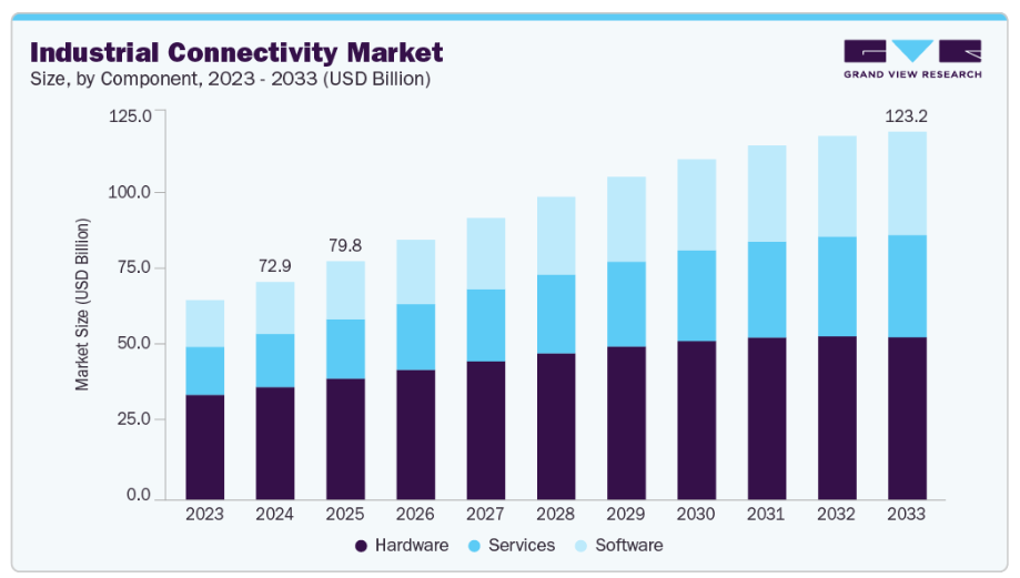 加えて、スマートファクトリーやインダストリー4.0の取り組みの台頭が、相互接続システムに対する堅調な需要を生み出しています。産業用コネクティビティは、クラウドコンピューティング、エッジアナリティクス、AI駆動型インサイトを活用することで、予知保全、エネルギー管理、サプライチェーン最適化を実現します。これらのソリューションは生産性を向上させ、拡張可能な運用とデータ駆動型の意思決定を支援し、企業に市場での競争優位性をもたらします。