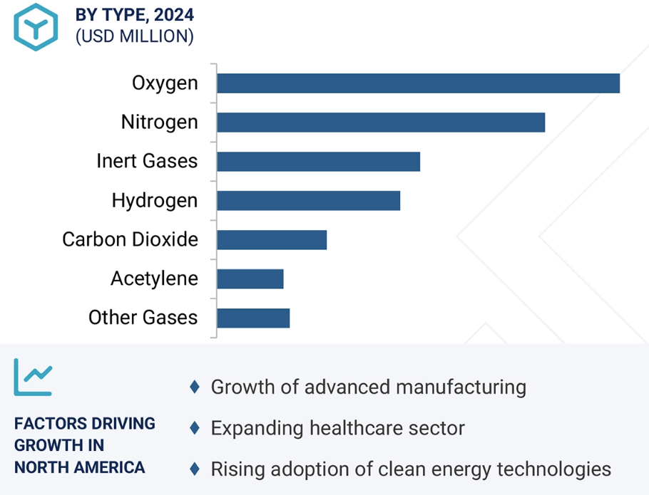 北米は、その大規模な産業基盤、技術進歩、多様な最終用途産業により、予測期間中、工業用ガスの最大の市場となる見込みです。同地域は高度に発達した製造、化学、医療、エネルギーセクターを有し、酸素、窒素、水素、二酸化炭素などのガスを大量に消費しています。さらに、大規模な人口がこれらのガスの需要をさらに押し上げています。米国およびカナダの医療は、先進的な医療インフラと家庭用・施設用呼吸器ケアの需要増加を背景に、医療用ガスの最大の消費先となっています。一方、メキシコ湾岸地域では、発達した化学・石油化学セクターが高度な要求を課しており、加工、精製、特殊化学品の生産に大量の工業用ガスを必要としています。北米はクリーンエネルギー構想、特に水素生産や炭素回収プロジェクトにおいても主導的立場にあり、ガス供給源の拡大に寄与しています。食品・飲料業界も、炭酸ガスによる炭酸化、保存、調整雰囲気包装用途など、ガス需要を押し上げています。さらに、エネルギー転換や先進的製造プロジェクトへの継続的なインフラ開発と投資が、予測期間を通じて北米が世界の産業ガス市場における主導的地位を維持する一助となるでしょう。