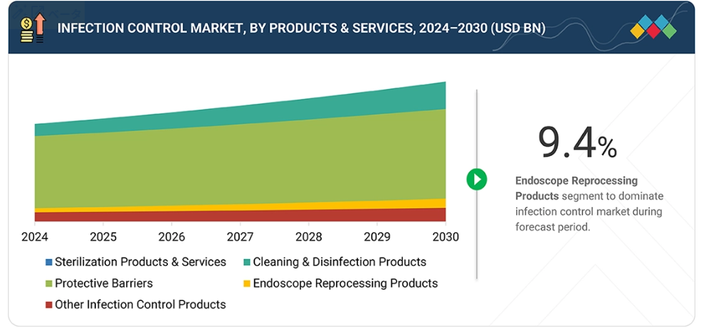 感染管理市場は、医療関連感染(HAI)の発生率上昇、外科手術件数の増加、再処理技術の継続的進歩など、複数の重要な要因により成長を遂げております。その他の推進要因としては、食品の滅菌・消毒への注目の高まり、滅菌装置技術の向上、ならびに製薬会社・医療機器メーカー・病院におけるサービス外部委託の増加傾向が挙げられます。こうした成長にもかかわらず、市場は課題にも直面しています。再処理器具の安全性への懸念、化学消毒剤に関連するリスク、内視鏡再処理の高コスト(限られた償還制度によってさらに悪化)などが挙げられます。一方、発展途上国における医療機器・製薬セクターの拡大、エチレンオキシド滅菌の再活用、電子線滅菌の採用増加などから新たな機会も生まれています。主な障壁としては、高度な医療機器の効果的な滅菌、代替表面消毒法の台頭、そして従来の再処理技術への依存度を低下させる可能性のある使い捨て医療機器の普及が挙げられます。