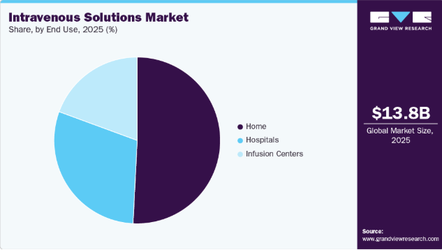 最終用途別では、2025年に家庭用セグメントが最大の市場シェアを占め、予測期間中に最も高いCAGRで成長すると見込まれています。これは慢性疾患患者における在宅医療の選好度上昇が要因です。化学療法、感染症に対する抗生物質治療、嚥下障害などの状態に対する水分補給療法など、長期的な静脈内療法を必要とする多くの患者は、病院やクリニックではなく自宅で治療を受けることを好みます。この変化は主に、頻繁な通院を避けたいという願望、院内感染リスクの低減、そしてより高い生活の質を維持したいという意向によって推進されています。