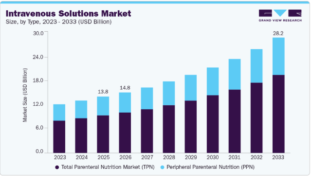 栄養不良は静脈内輸液市場を牽引する主要要因の一つである。WHOによれば、2022年には25億人の成人が過体重であり、そのうち8億9000万人が肥満、3億9000万人が低体重であった。世界では5歳未満児1億4900万人が発育阻害状態にあり、4500万人が低体重、3700万人が過体重または肥満でした。この世界的な栄養不良の高頻度が市場成長に寄与しています。ユニセフによれば、乳児生後1000日間の栄養不良は認知能力の低下や発育阻害につながる可能性があります。乳児の食事には、でんぷん、ミネラル、ビタミン、アミノ酸、脂質、その他の主要物質が含まれている必要がある。これらの必須栄養素は非経口栄養(PN)によって投与可能であり、これが市場拡大を促進すると予想される。これらの栄養素を必要とする栄養不良児や早産児の多さが、市場をさらに牽引すると見込まれる。