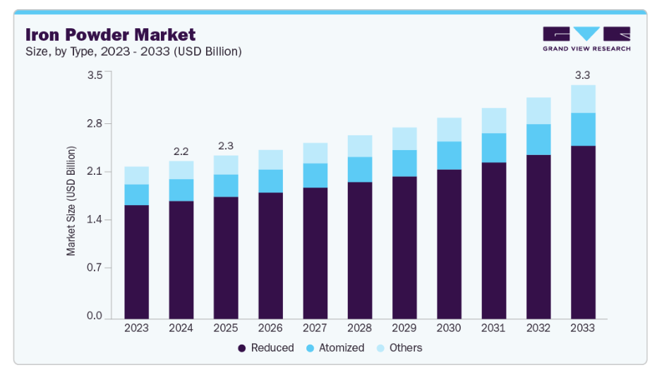 - 種類別では、アトマイズド鉄粉が2024年に74.0%超の収益シェアを占め、市場を主導しました。